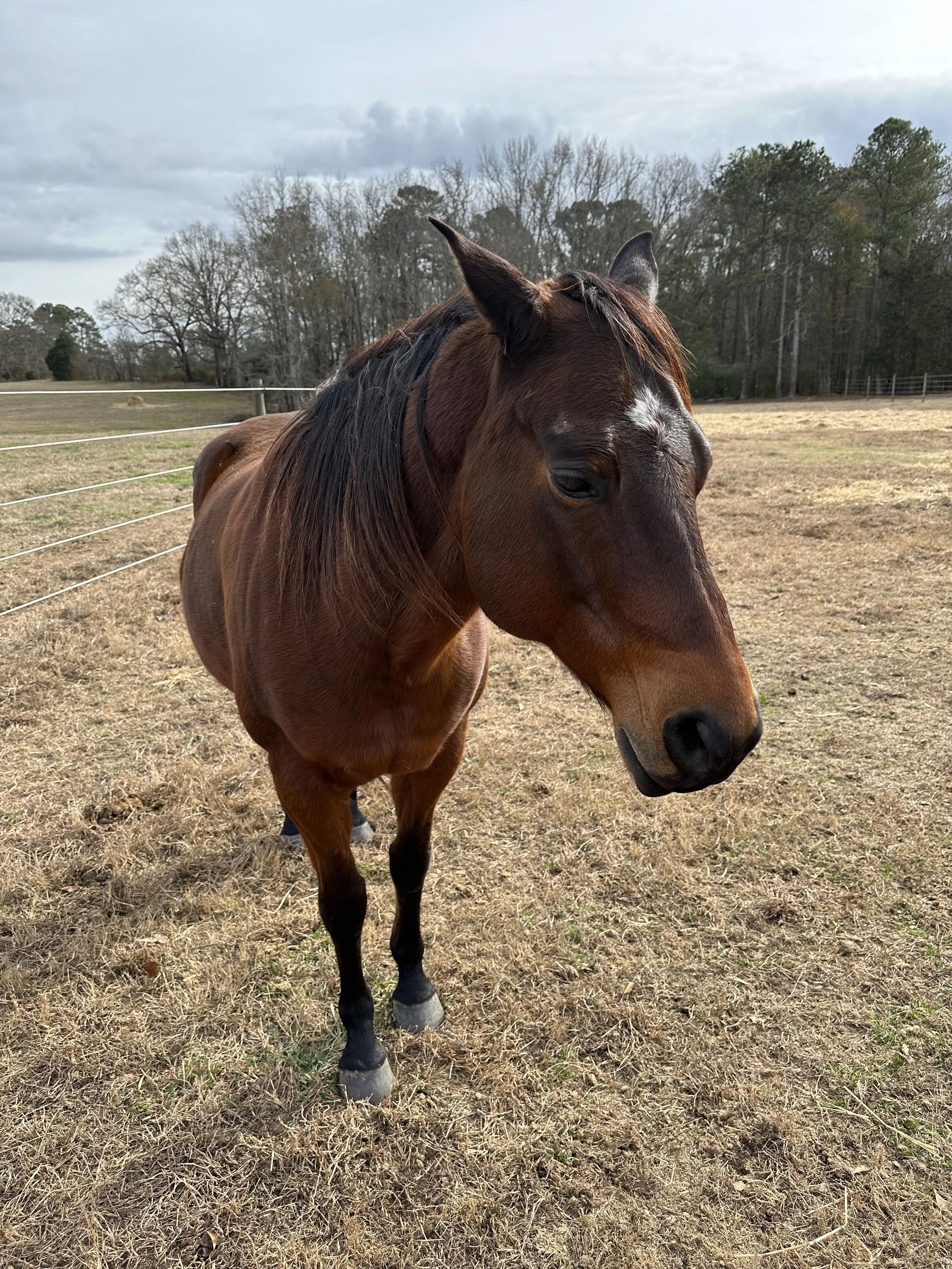 Harry is a 13 year old quarter horse. This fancy boy fell into Jess’ lap shortly before opening the shop. After a 3 month stint in rehab he is now back on his feet, and enjoying semi-retirement. He’s the sweetest, best boy, and will only know kindness and love as Dark Horse’s mascot.